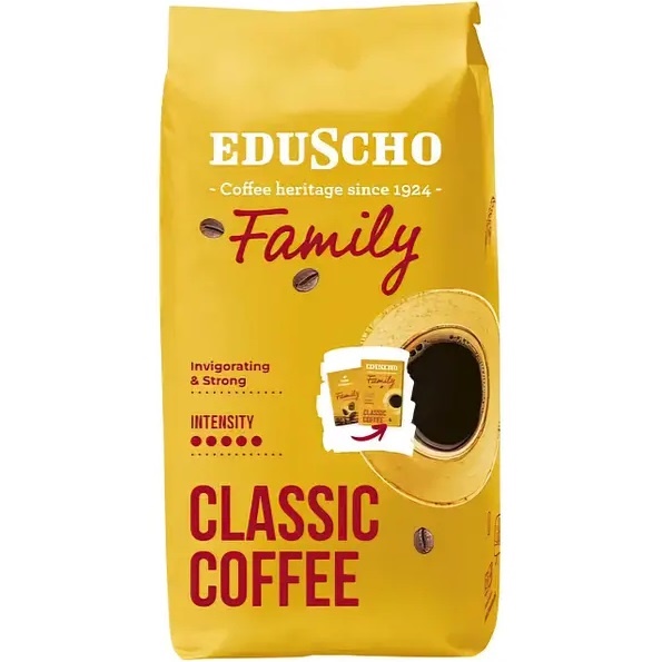 Eduscho Family — це універсальна кава в зернах яка ідеально підходить для повсякденного споживання вдома чи в офісі. Поєднання зерен Арабіки та Робусти забезпечує збалансований смак із приємною міцністю м’якою гірчинкою та делікатним ароматом. Оптимальна для приготування в автоматичних кавомашинах еспресо-машинах або в турці.